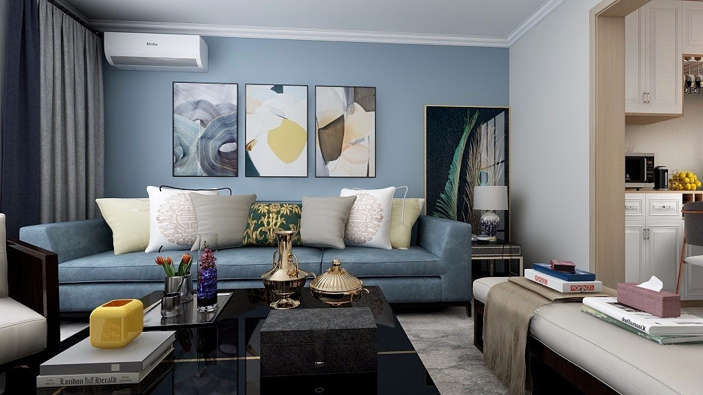 蓝色的背景、深蓝色的沙发,带上那么丢丢的马卡龙黄,阳光透过纱帘朦胧的打在身上,自然的气息在弥漫,宁静又深远