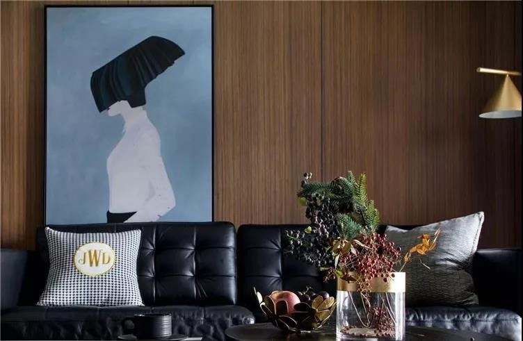客厅选取护墙板木质元素,与皮质沙发、石膏线条、等不同材质的组合,以新现代主义的审美视角展现当代气质。