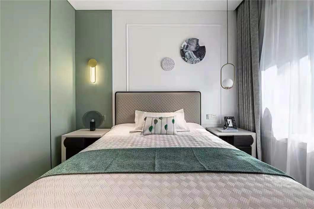 沙发背景墙采用的森林绿色系的乳胶漆,加以石膏线条的装饰手法,让整个空间显得大气,延伸感很强,动态十足