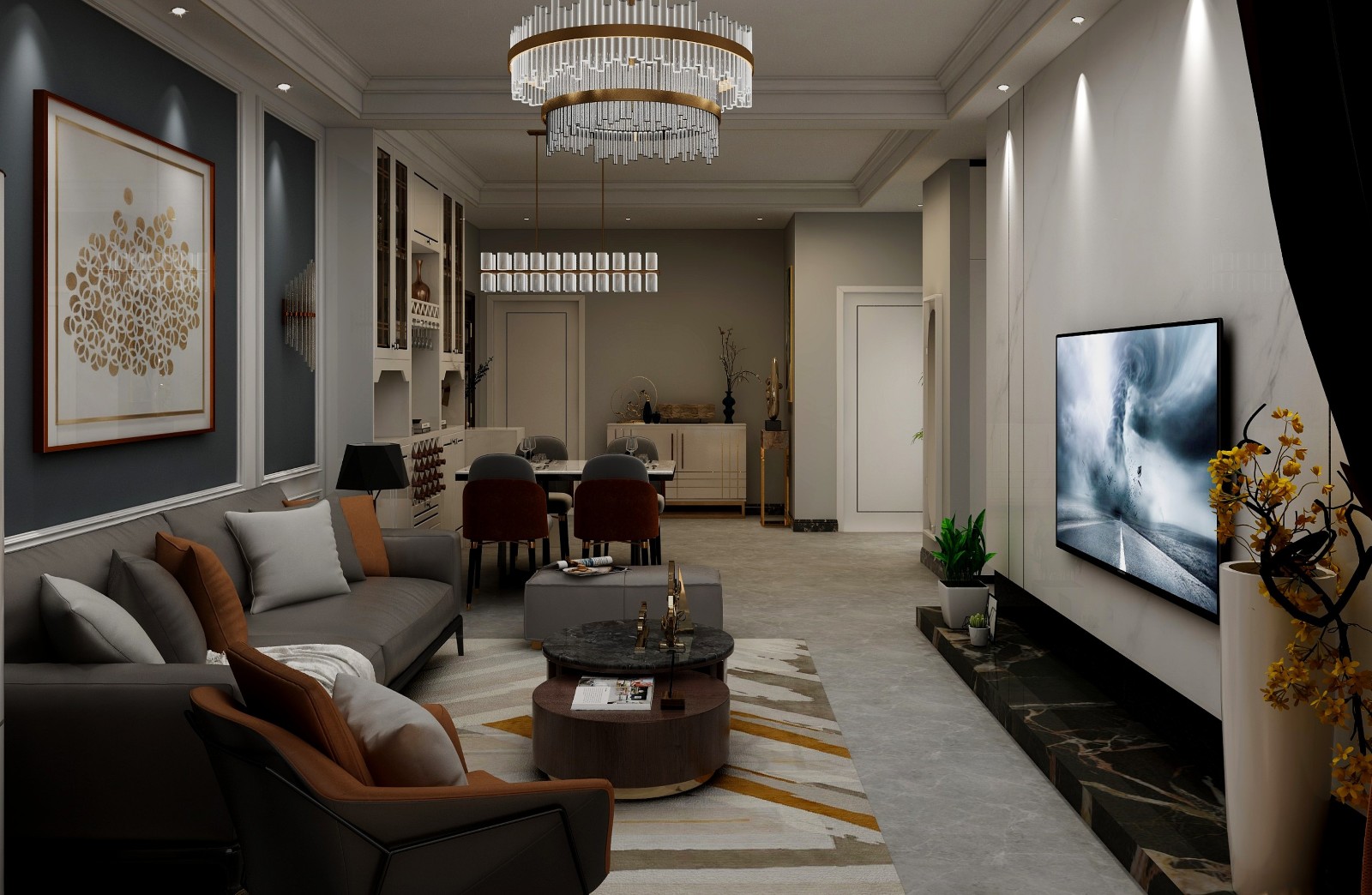 客厅以灰色调为主,灰色可以给人以温暖的感觉,它可以引导风格前卫而迷人,同时又能给予人镇定,舒缓或充满活力