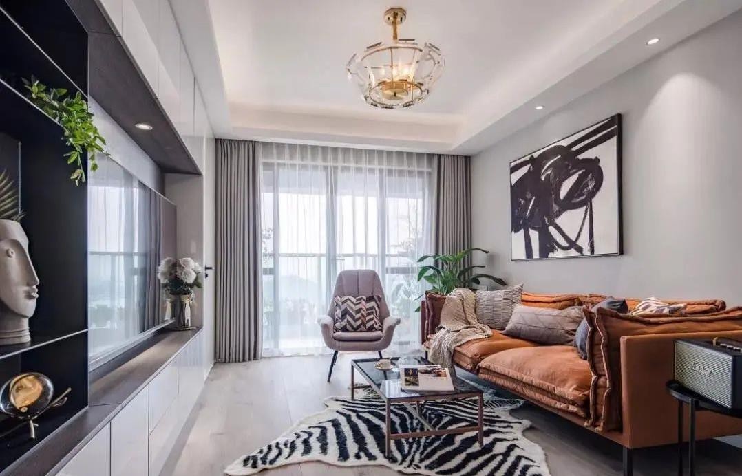 客厅整体以灰色调为主,搭配橙色的沙发、创意的挂画和一个虎皮纹地毯,软装与硬装的结合,给人一种安逸感在空间展开的感觉。