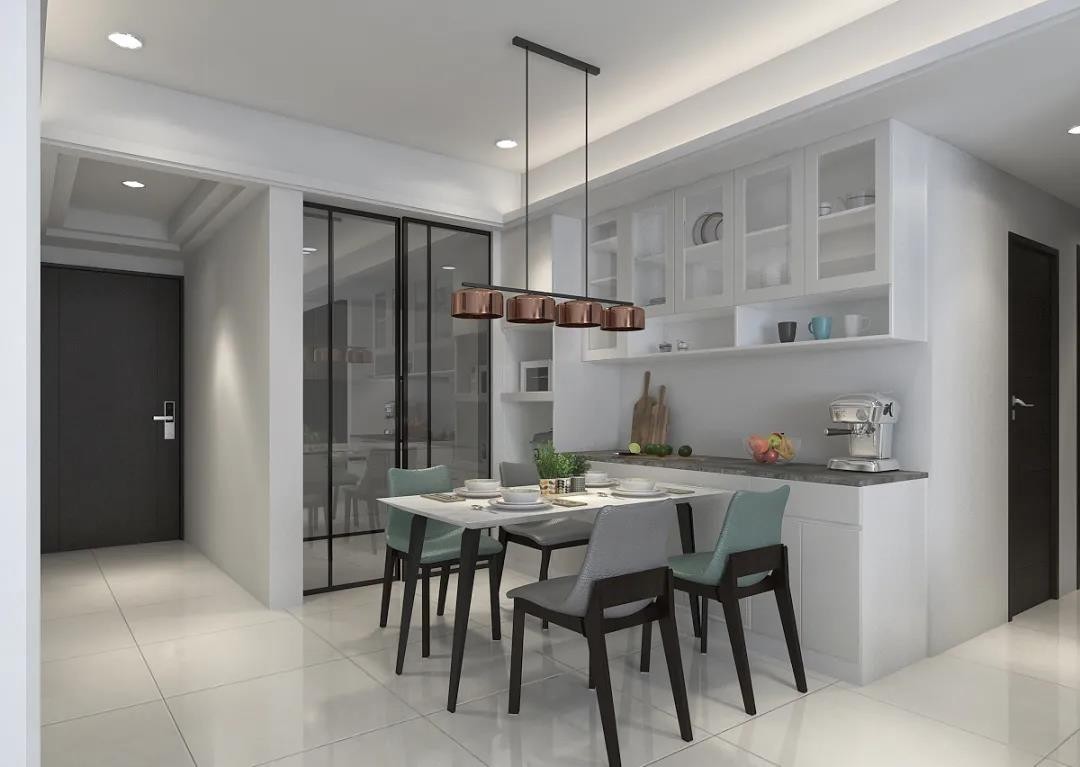 餐厅空间餐柜结合电器柜的功能完整,并植入石纹系统板,提升质感,厨房玻璃铁件拉门,解决了空间的油烟问题同时也解决了厨房的空间视线