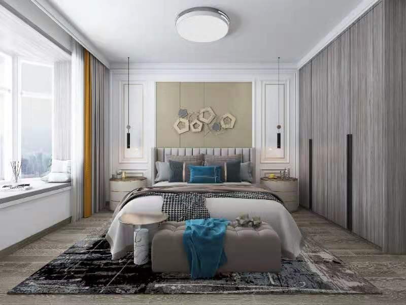 窗帘的杆改成隐藏式的 床头背景墙的设计提升主人的生活精致。