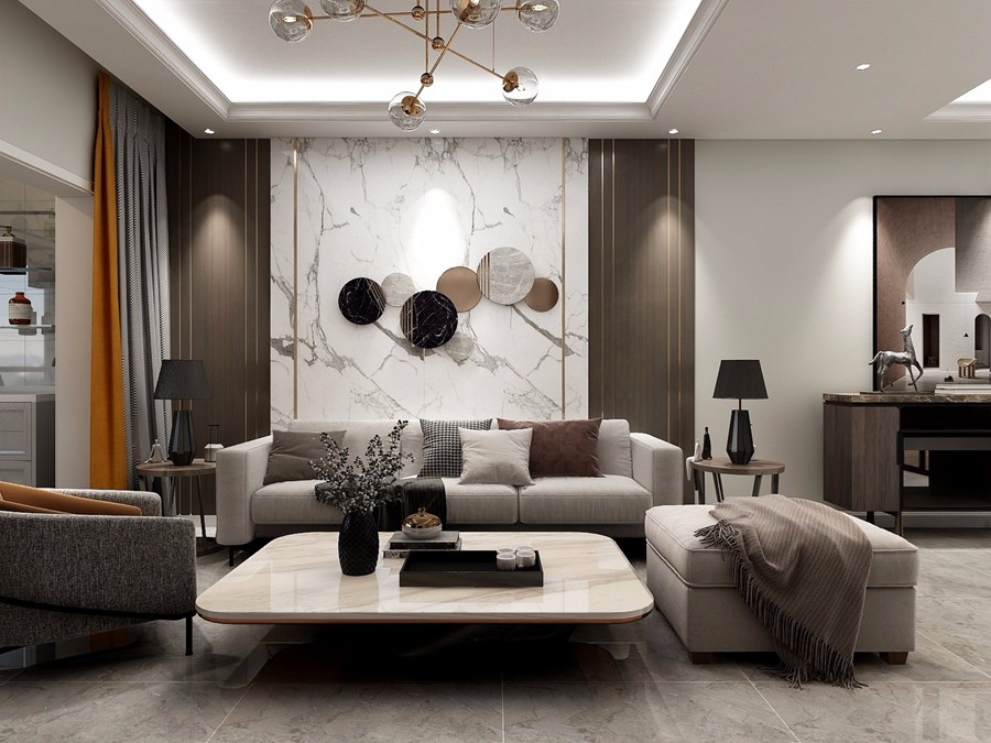 客厅:电视背景墙用石材上墙和木饰面构成,无论是居家日用,还是带人接客都不失典雅大气。沙发背景和电视背景墙相呼应,使整个空间更加整洁有序。