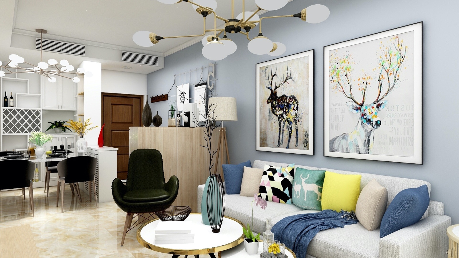餐厅:厅与客厅做了错位处理,对门餐厅进行区域划分,餐厅两面墙旁边坐了两个酒柜,一方面满足了储藏功能,另一方面给出房门也做了一面装饰墙,设计师为居住的主人公设计了充分的储物空间。