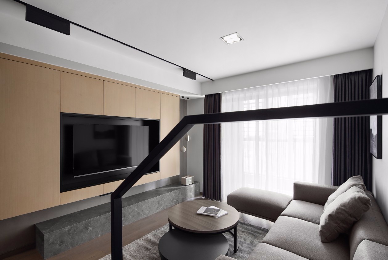 电视背景选择橡木原色木皮一直延续到房门,视觉上形成延申感。地面材质选择灰色橡木地板与灰色沙发形成色彩上的延续统一。