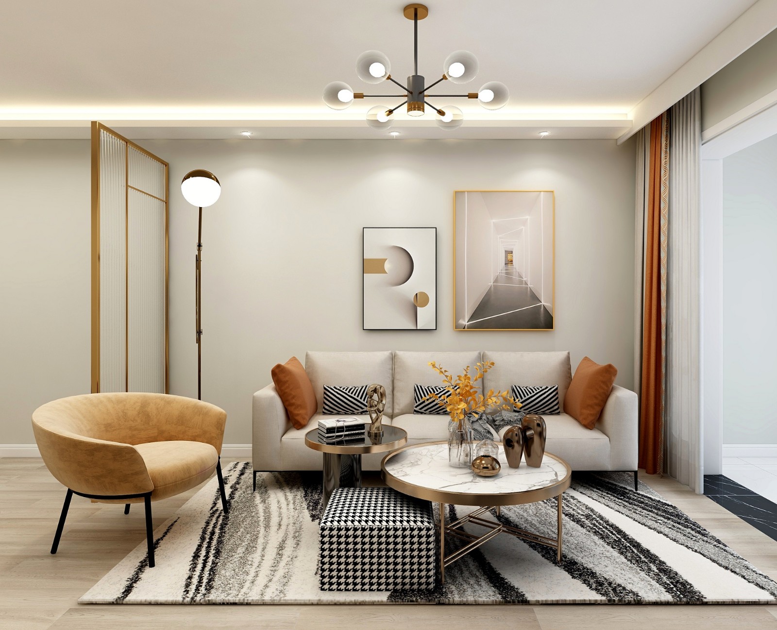 3+1的沙发和圆形茶几,单人沙发颜色做差色处理。