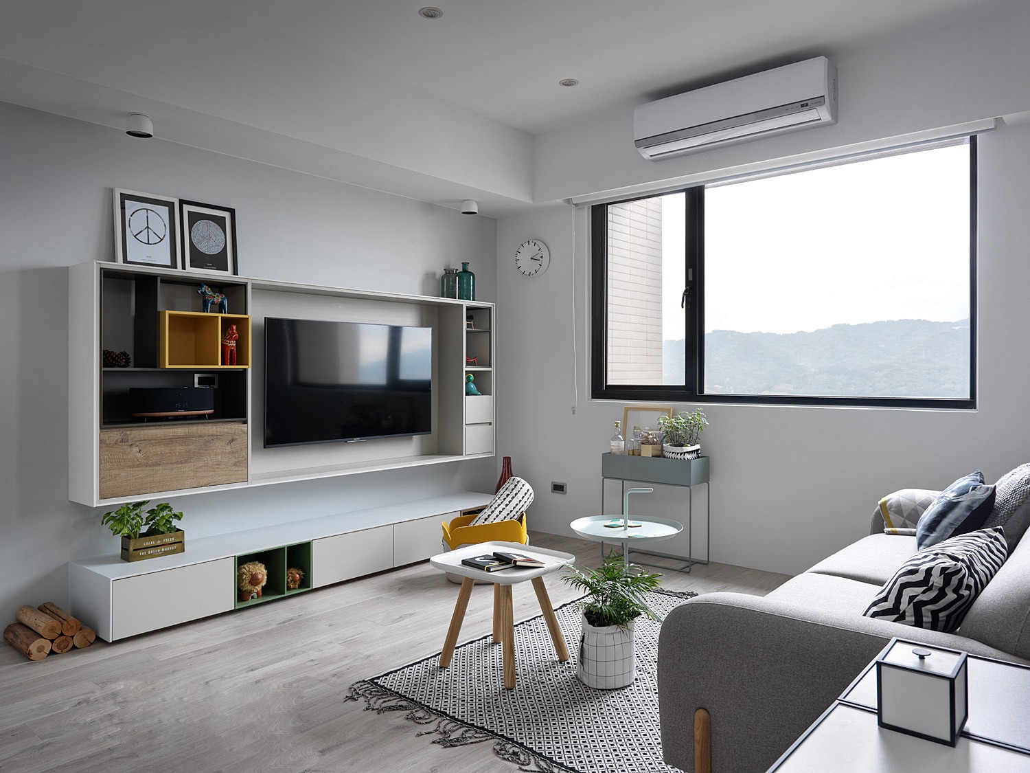 客厅以小方桌来当作茶机,整体配色简单,黑白灰黄,而电视墙则以壁柜的 形式来表达,完全可以把客厅当作书桌来使用。
