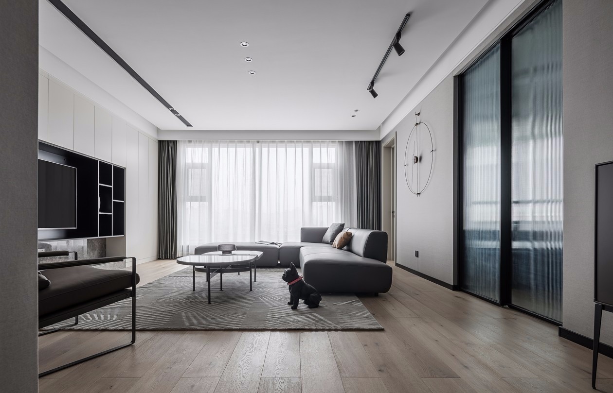 客厅采用不失经典的黑、白、灰系作主调,描绘开阔空间,同时用温润质感的胡桃木营造家的温馨与优雅。注重空间的开放、交流、互动性,不仅美观性、实用性、功能性下足功夫,还为业主的未来生活做好铺垫,精选环保材料,注重生活细节,为业主打造了一个幸福浪漫的港湾。