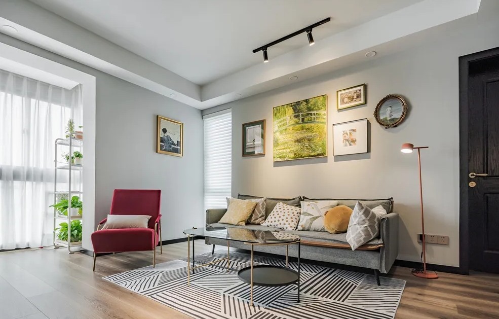 将原本L型阳台的隔断拆除, 部分阳台纳入到客厅空间, 不仅给客厅带来更加直接的采光, 也令整体空间更显宽敞。沙发背景采用了组合画的形式, 颜色材质尺寸各不相同, 但是整体又十分融洽