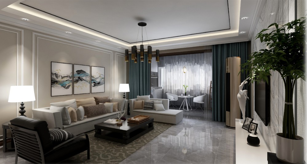 本案采用客户的意见以及房屋的缺点以及优点并用,合理的搭配出 了房主喜欢的冷色系搭配,地面以灰色做大面积填充,墙面采用壁布整体修饰电视墙采用大理石造型定制使整个房子大气不失优雅。 顶面:采用点光源以及线光源的装饰以及主灯的点缀,使整个设计 更有层次感。