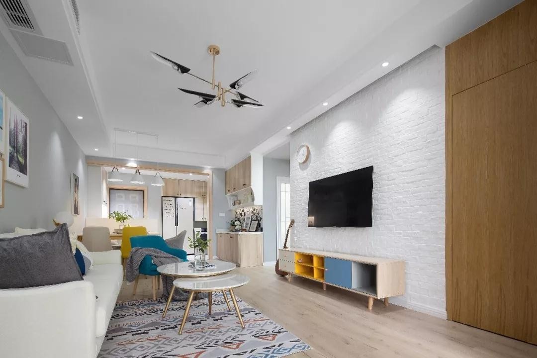 色和蓝色相间的电视柜,让客厅变得更有活力,软装细节的设计非常关键。