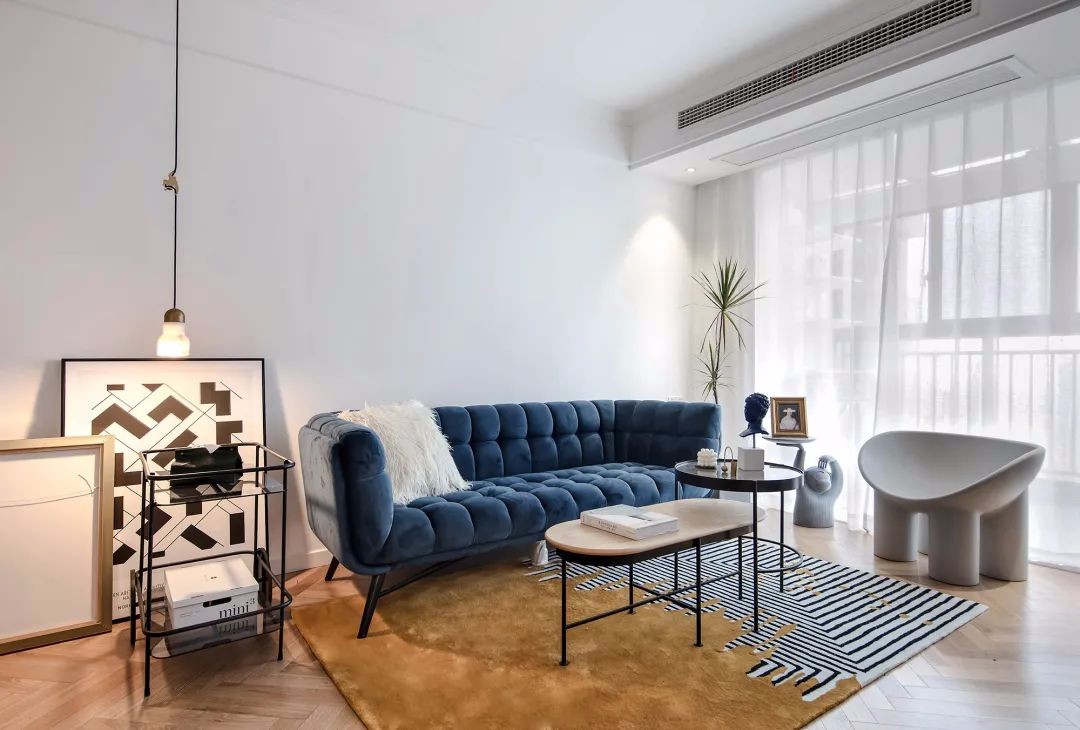 采用白墙+白纱,点缀一些绿植, 再利用沙发与地毯的对比色、跳色, 让这个纯净的空间多了一抹跳脱。