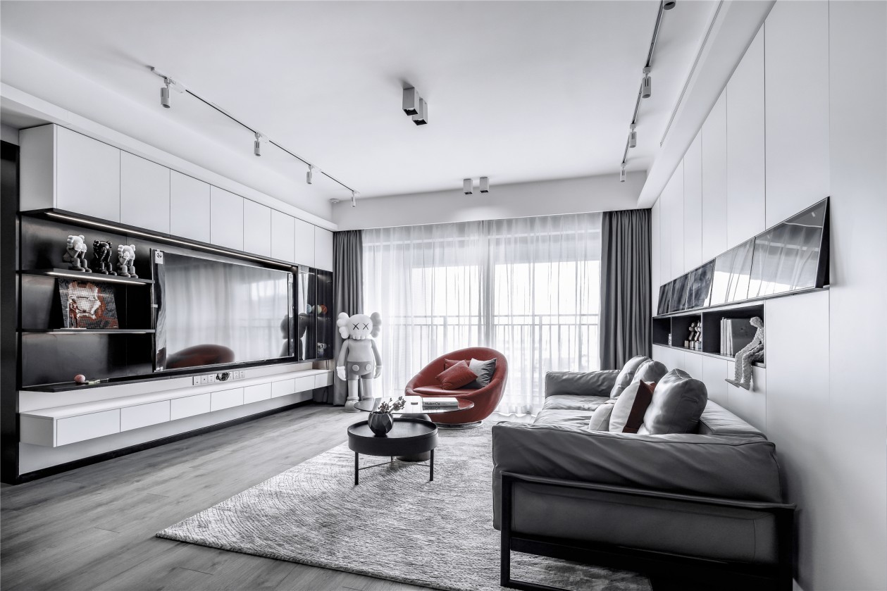 客厅与山海相依,自然成画,随四季变换光色,或绚烂或清丽,与室内简约的灰色、白色形成明显对比,交织折射在镜面上,形成另一种视野,同时也映出舒适惬意的生活日常。KAWS时尚元素和个性摆件,设计不会刻意的消匿城市亦现实对家庭的影响,因为那也是家庭的一部分,设计所强调的是平静安稳的空间氛围,生活品质与空间艺术,以及那象征着梦想的澳网网球。