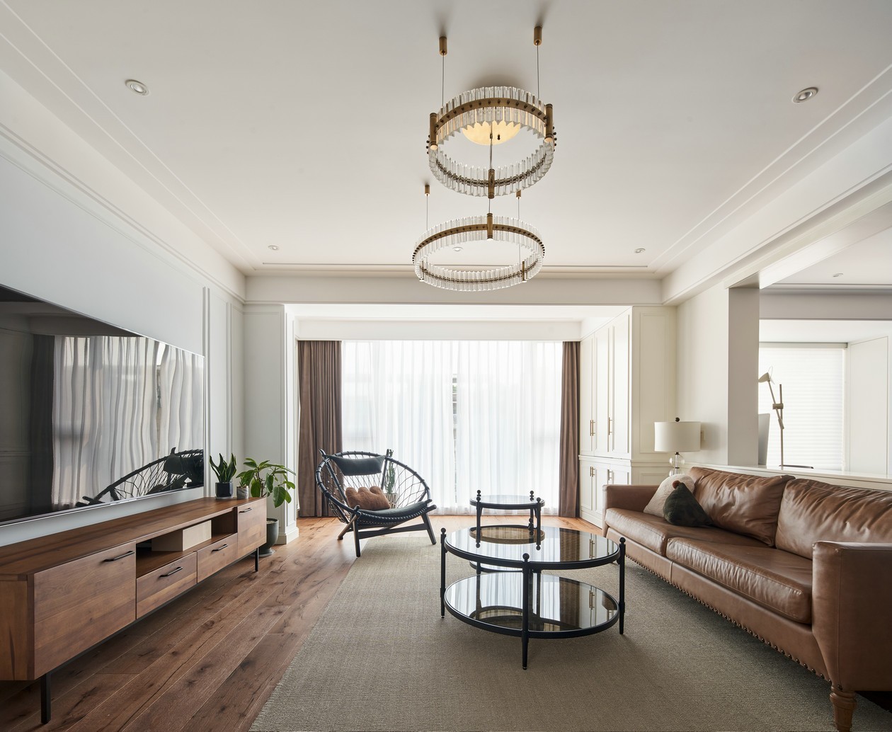 开放式的空间布局纳入更多自然清气,空间通透而明亮,大面积的白色作为基底,配以原木地板及棕色皮质家具来丰富空间的质感,充满活力的蓝色点缀其中,搭配去繁从简的留白艺术,可以大大满足城市人对于自然生活的期待。