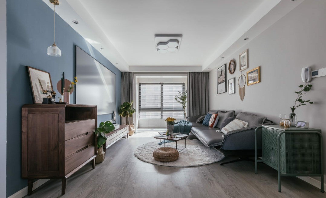 解锁客厅喽,客厅沙发背景墙有3米左右,所以为了找这个适合的沙发一直找了很久,这款气质沙发长2.8米左右还带转角,重要的是颜值高真的不好找。 电视背景墙刷的都芳深蓝色的涂料,配上硬幕投影还是很出效果的。玄关柜和电器柜是组合的一套柜子。