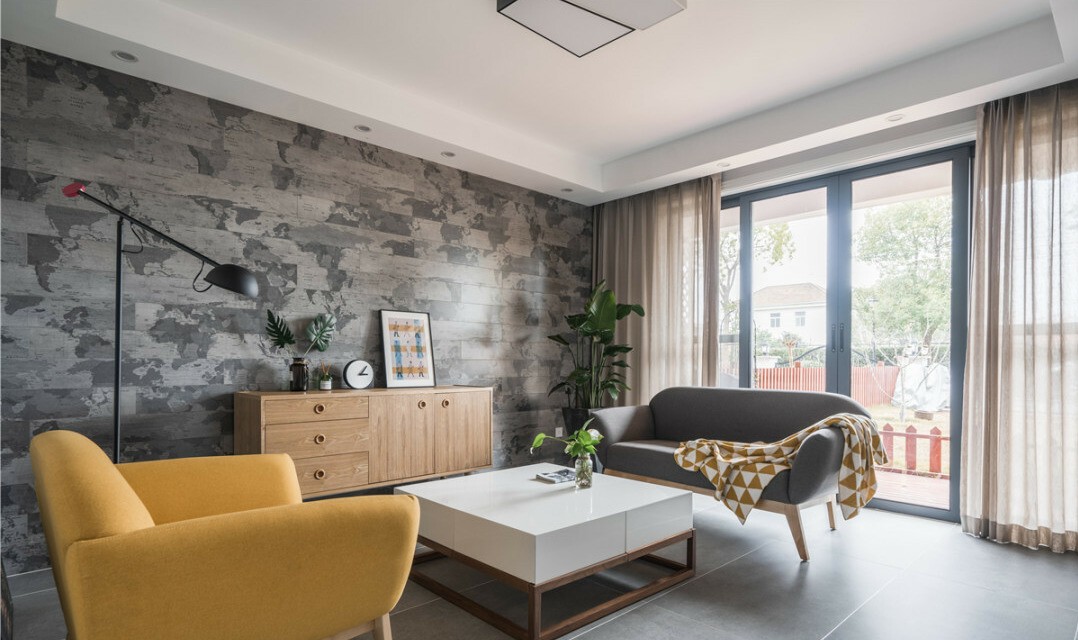 在客厅处,设计师用简洁纯粹的设计手法,以灰色和原木色沉淀空间质感,再利用黄色点亮空间,演绎时尚简约的灵魂。