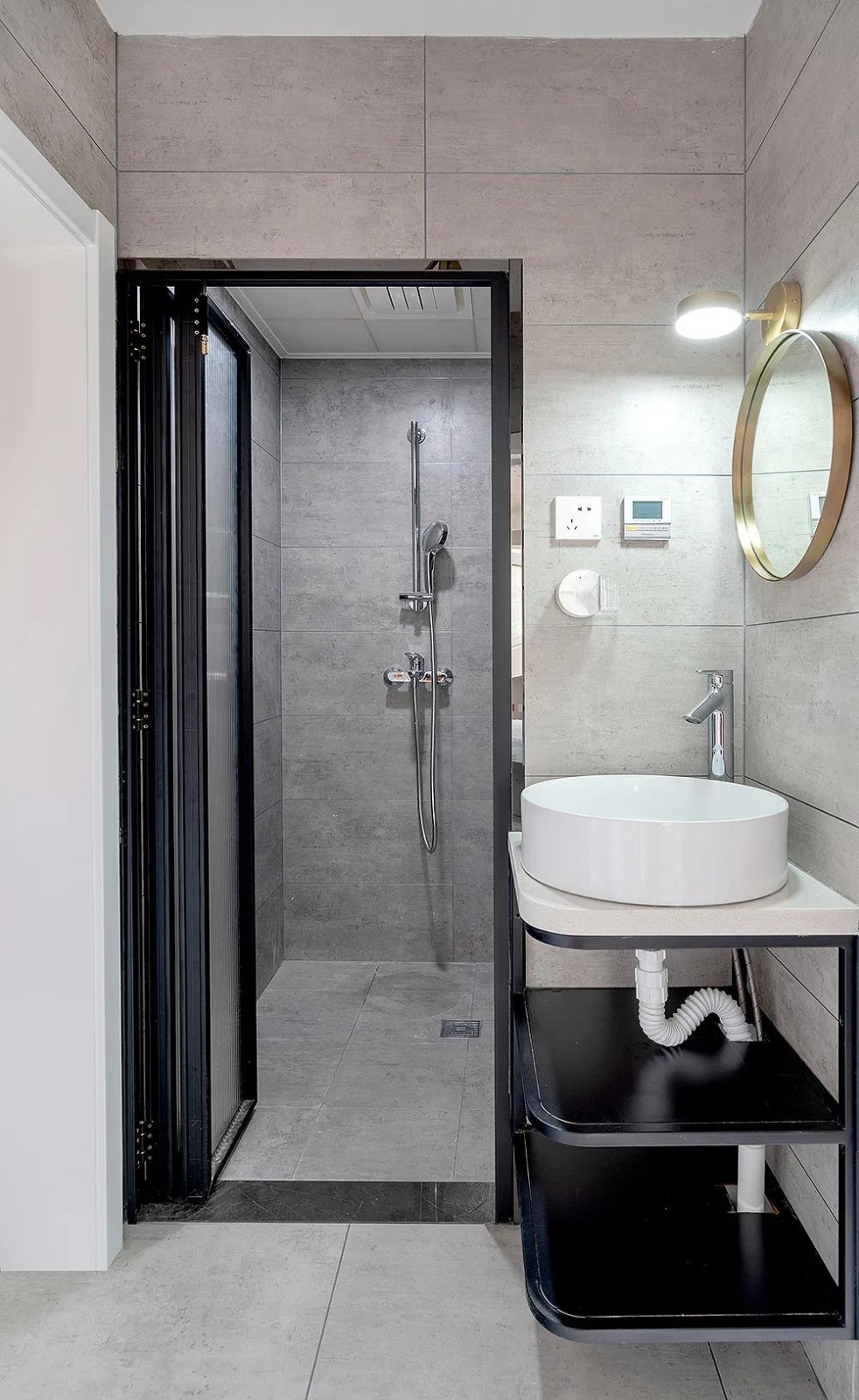 卫生间选用钛镁合金材质的折叠门,搭配黑色金属材质门套,给空间带来***简单的质感。盥洗池下方采用开放格设计,既实用又美观。