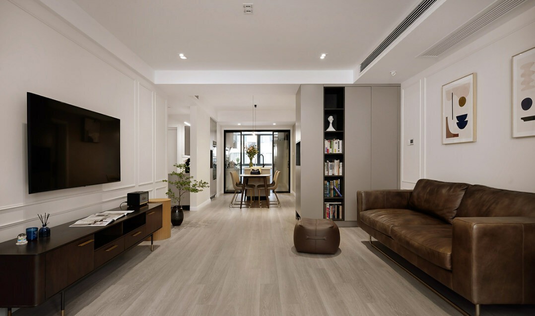 原始层高2.6米,全屋做满吊顶后,空间感会有一丝压抑。设计师利用无主灯设计,打造简洁大方的空间感,同时在客厅墙面用石膏线做造型,拉伸视觉效果,凸显立体感。