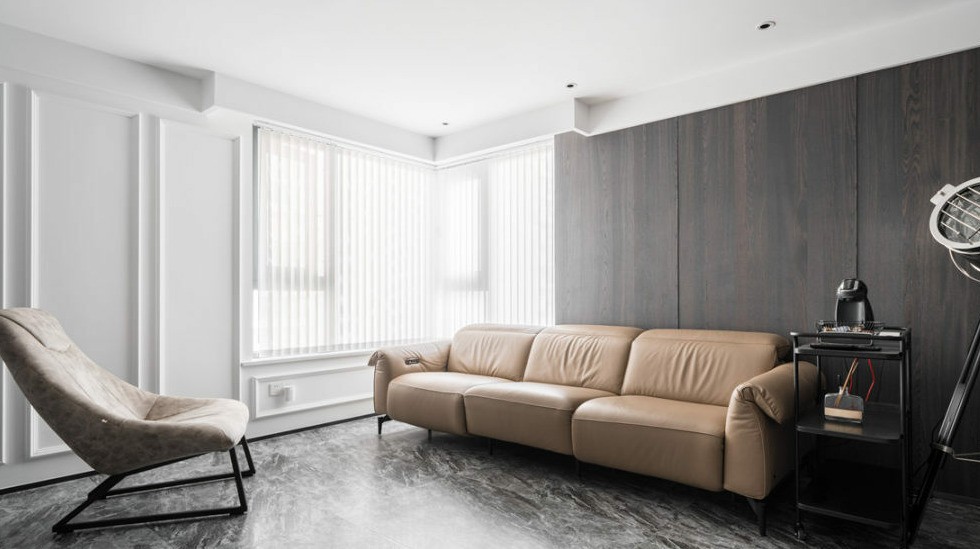 客厅采用大量的留白烘托出简约大气的设计风格。沙发背景用三块深色木饰面,增加客厅的纹理感,搭配黄色皮革软装,让整个空间塑造出炫酷时尚感的同时又有一种耐人寻味的深沉气质。