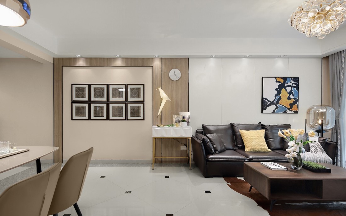 客厅简洁明快的线条让整个空间更显开阔明亮,皮质的家具调性跟木纹让整个空间显得更协调跟温暖。