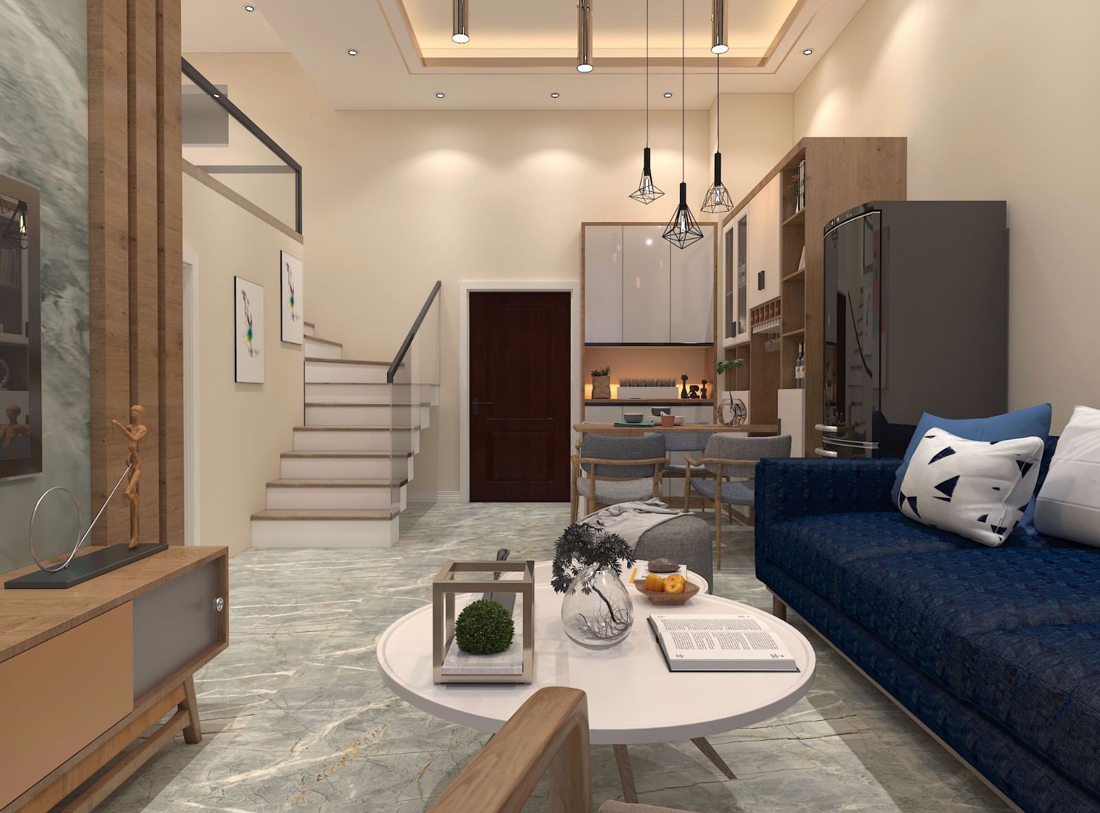 本区域为客厅区域,放眼望去整个客厅挑高充足没有压迫感,上下两层利用转角楼梯相互连接,同时楼梯下的空间也做合理规划,定制柜体,增加入户置物的储物空间
