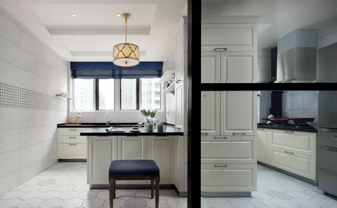 厨房用玻璃门隔断,保证室内采光,也不怕油烟乱跑。