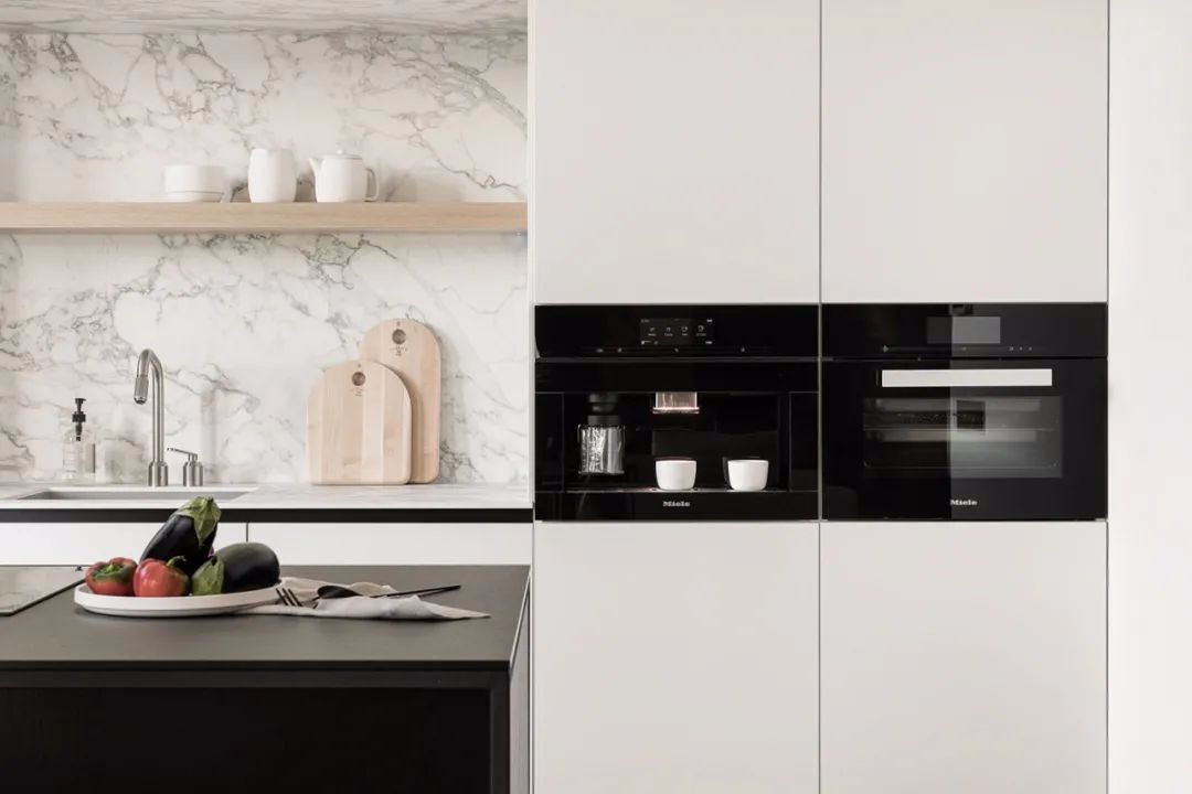 开放式的厨房设计也非常的简单,白色的柜门、大理石防溅挡板、木质隔板置物,交相呼应,展现出简洁干净的空间感。
