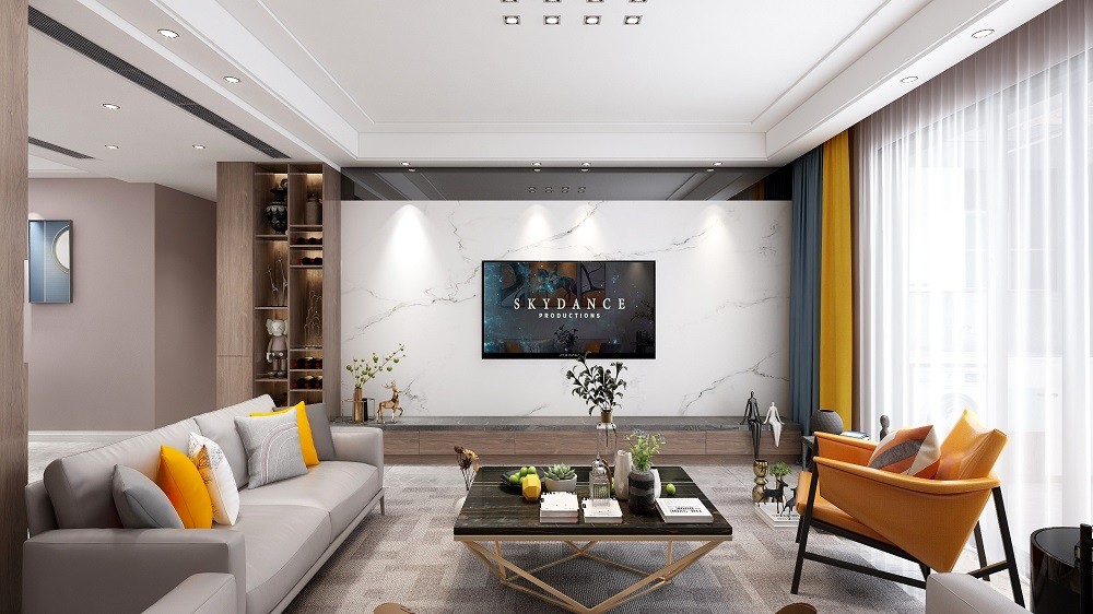 整体为现代风格设计,入户门厅为玄关换鞋区域,地面贴800*800地砖,餐桌为6人位圆桌,吊顶造型为简单吊顶,地面贴800*800浅灰色瓷砖,墙面为浅灰色墙布,客厅家具上沙发位为3++1,电视背景墙为成平电视柜及收纳为一体。