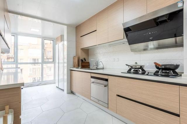 厨房在大规格的白色六边砖,搭配木质橱柜,生活阳台打通成为厨房的一部分,整体空间在大面积落地窗的烘托下,显得明亮优雅大方。
