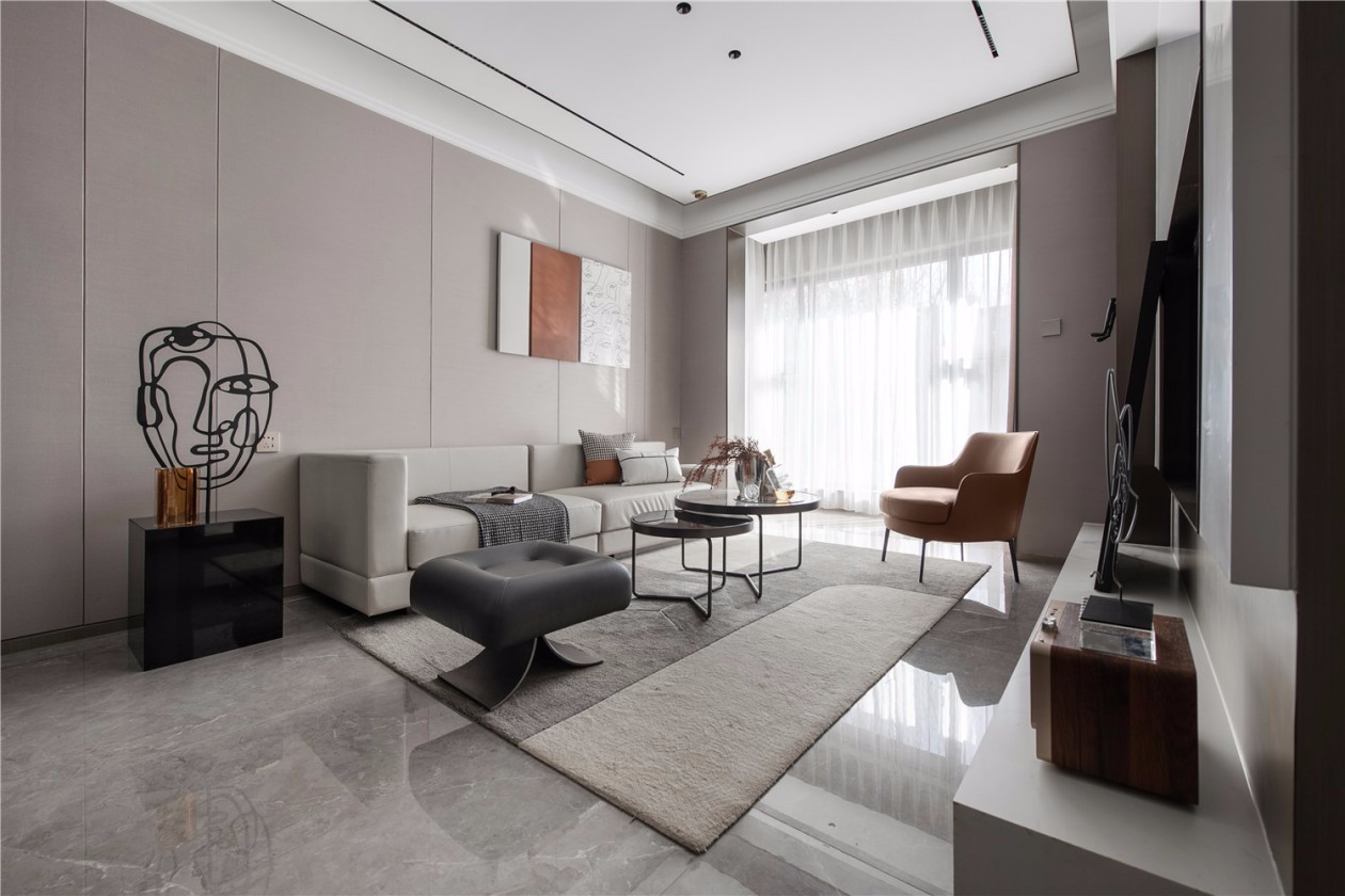 客厅以冷静克制的黑白灰为基础色,大地棕为辅色,局部点缀卡曼橘色。座椅旁伫立着醒目的毕加索的线条主义为原型的雕塑,宣告主人拒绝平凡的生活态度。