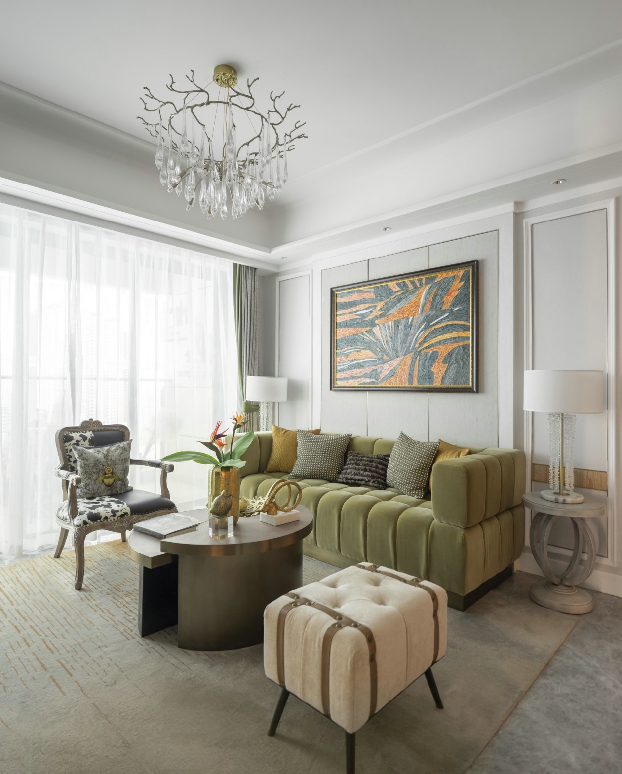 米棕色系丝绒触感的现代沙发,搭配碎花与雕花点缀的法式复古单人椅,与唯美浪漫的水晶吊灯,整体空间呈现出一种直撩心底的优雅魔力,给归家者带来惬意舒适、优雅矜贵的生活气息。