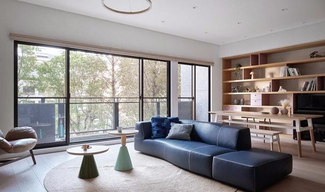 沙发身后设计为展厅柜,采用肉粉色隔板和抽屉柜,在光下透着温柔和煦的光亮,丰富了空间原本的色彩层次,韵味尽显。