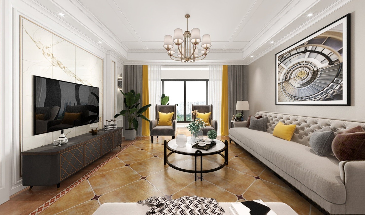 客厅整体以米色系为主,现悠闲、舒适、 自然的氛围,让人感觉十分惬意。 皮质电视柜搭配灰色的布艺沙发和地毯,一抹黄色点亮空间,色彩在空间过渡自然,创造一种不单调的和谐感。