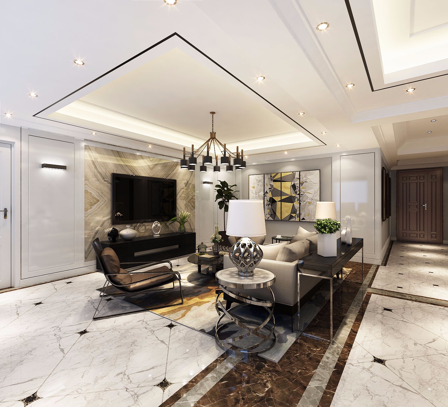 客厅以地面和天花划分区域 ,顶面回形吊顶内嵌不锈钢条和背景墙护墙板做秤砣。