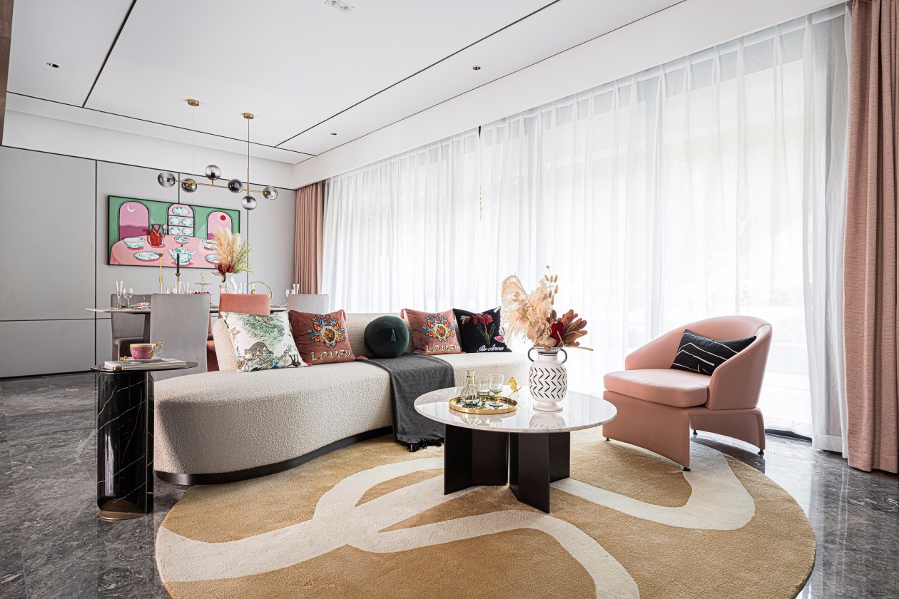 空间被粉色的几何元素、布艺和装饰画加持,毛绒的植物呼应丝绒抱枕增添空间的柔美和谐,在暖色灯光与自然光影的交相辉映下,营造一场如梦似幻的童话梦。