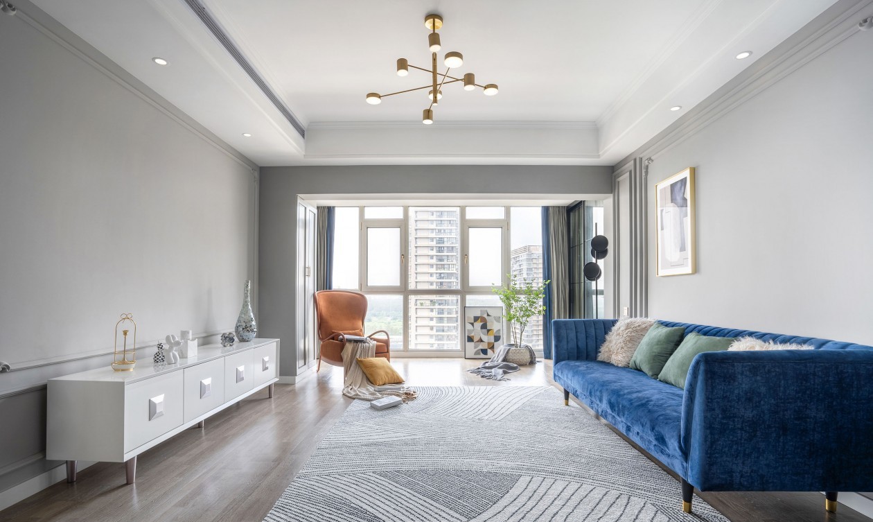 客厅是两个孩子经常玩耍的地方,于是,茶几特意选择了高低错落,边角圆润的款式,给孩子营造安全的环境;阳台的纳入也给孩子更多的空间去玩耍,父母可以陪孩子在地毯上做亲子游戏,一起沐浴阳光下。回字型精美石膏线条设计,提升客厅的立体感;灰+蓝+棕的大胆撞色,时尚精致,柔和空间氛围;将客厅与阳台打通后,提高室内面积与采光,与洗衣阳台之间用黑框时尚推拉门做隔断,不显突兀,整体空间开阔明亮,入住之人,自然心情明朗