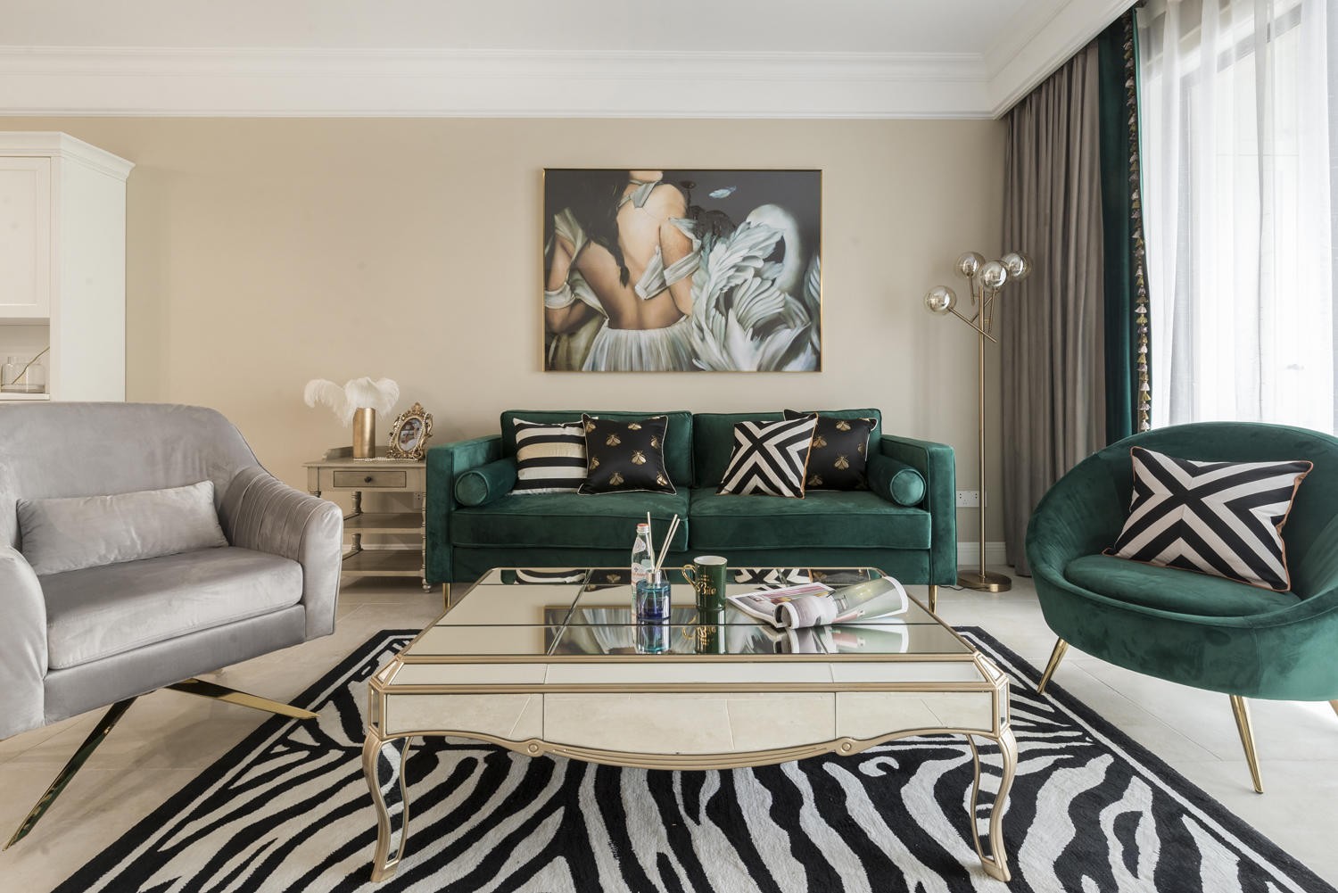 业主为中年夫妻二人,家里常住人口为三口人,加一个高中女儿,所以业主想把家装的比较豪华,看上去比较高端大气上档次。为了让整个客厅看上去不至于太过于单调或者单一,加了一些墨绿元素以及黑白进去,让客厅更富层次感。