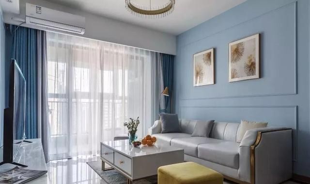 沙发背景墙造型简单,清新蓝让人耳目一新