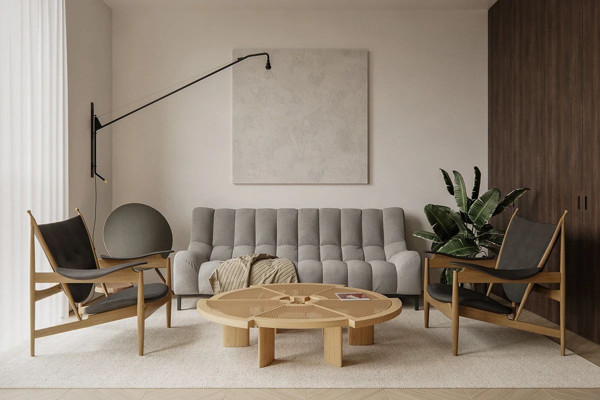 沙发前放置了一张藤艺的茶几 以及两把酋长椅 散发出一种高雅的气息 客厅使用壁灯来照明 赋予了空间内设计感和趣味性