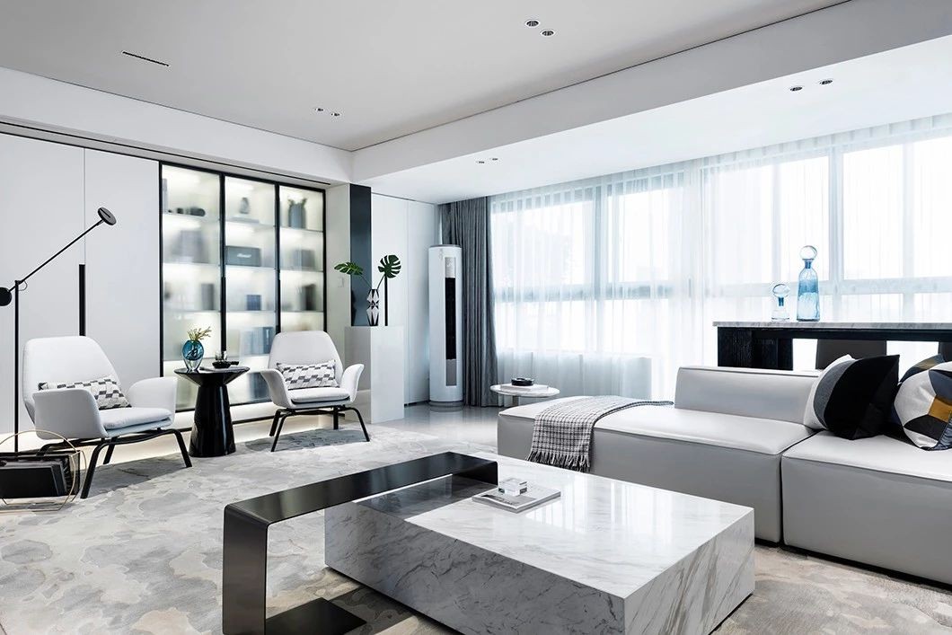 从空间布局和界限上突破常规思路,传达的是熟悉中有惊喜,常规中有新意。黑白灰的基色搭配静谧的蓝,跳跃而灵动。在表象的视觉之下,设计师极尽克制,投射出空间的美学与艺术的张力。