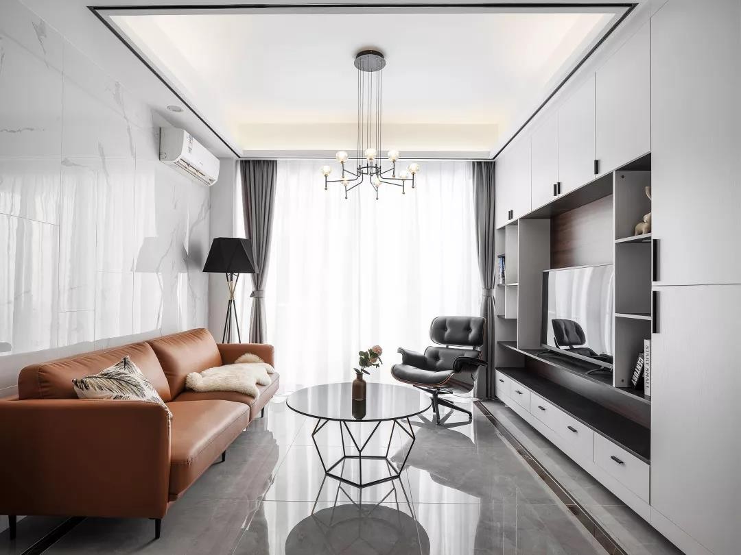 餐厅边上就是客厅空间,电视背景墙做了满墙的定制柜,地面铺贴的灰色地砖看上去就很有档次,让客厅更加明亮和轻松。