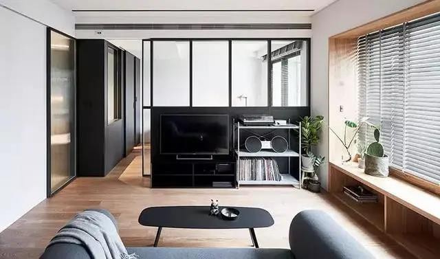 卧室设在电视墙背后,以玻璃黑色金属落地墙进行隔断。玻璃半墙设计既保留了通透感,又能兼顾隐私,非常适合小户型设计。