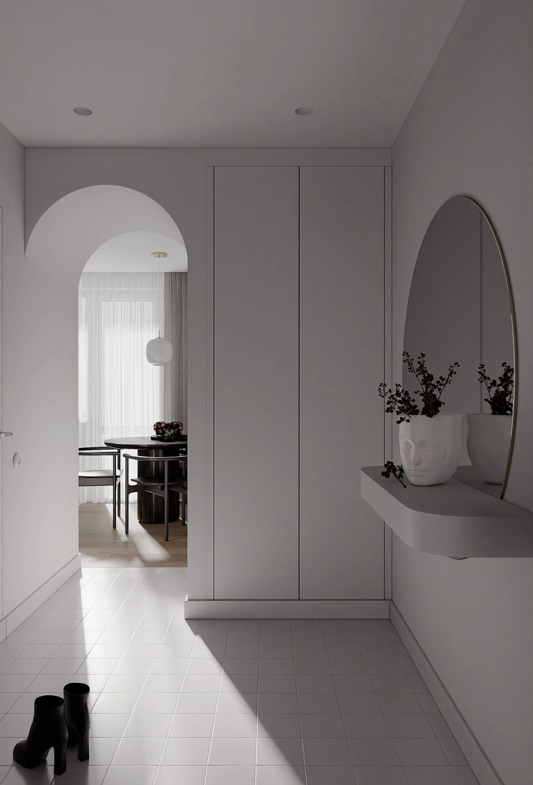 虽然整体面积小,但是玄关的空间很宽敞,在灯光的渲染下更加简洁大气,大面积的白色空间融为一体,用时尚现代的材质与元素,没有冗杂的装饰,每一处细节的考究都充满设计感。