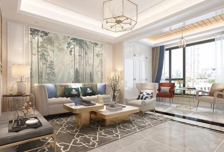 客厅电视墙和沙发墙设计对称造型,两侧白色造型全部选用石膏板和石膏线,精致而大气。活动家具全部选用轻奢、浑厚偏美式的。沙发墙中间设计壁画,让整个空间显得没有那么死板。