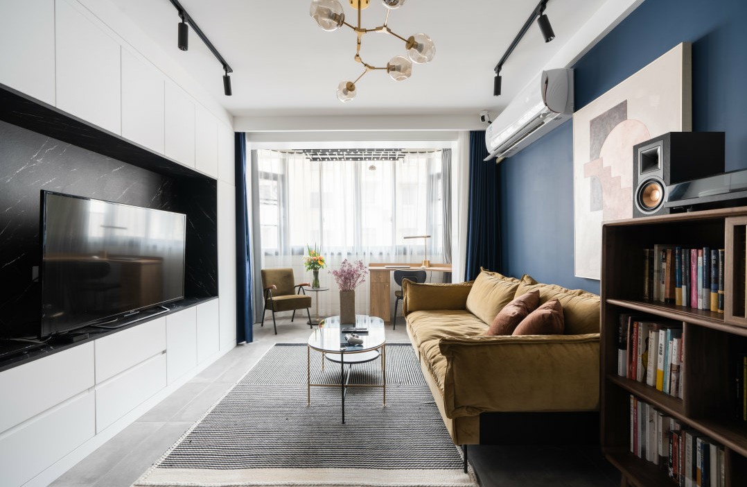 深蓝配上丝绒姜黄 暖暖的,沙发旁随手可拿的书和唱片机,一窝就是一整天。就这样,择一几之上,添一缕香、一卷书、一沏茶,便有了日常中沉思静悟、冥顿心灵的所在。