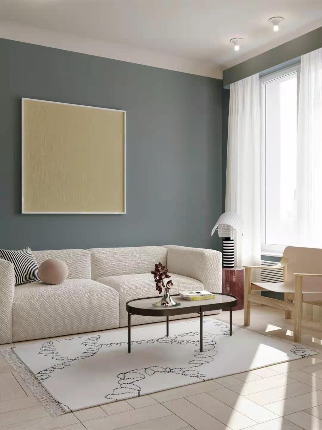 裸色的单人椅和地板的颜色相呼应,搭配白色的布艺沙发,阳光透过白色的沙帘,散落在屋里各个角落,岁月格外静好。