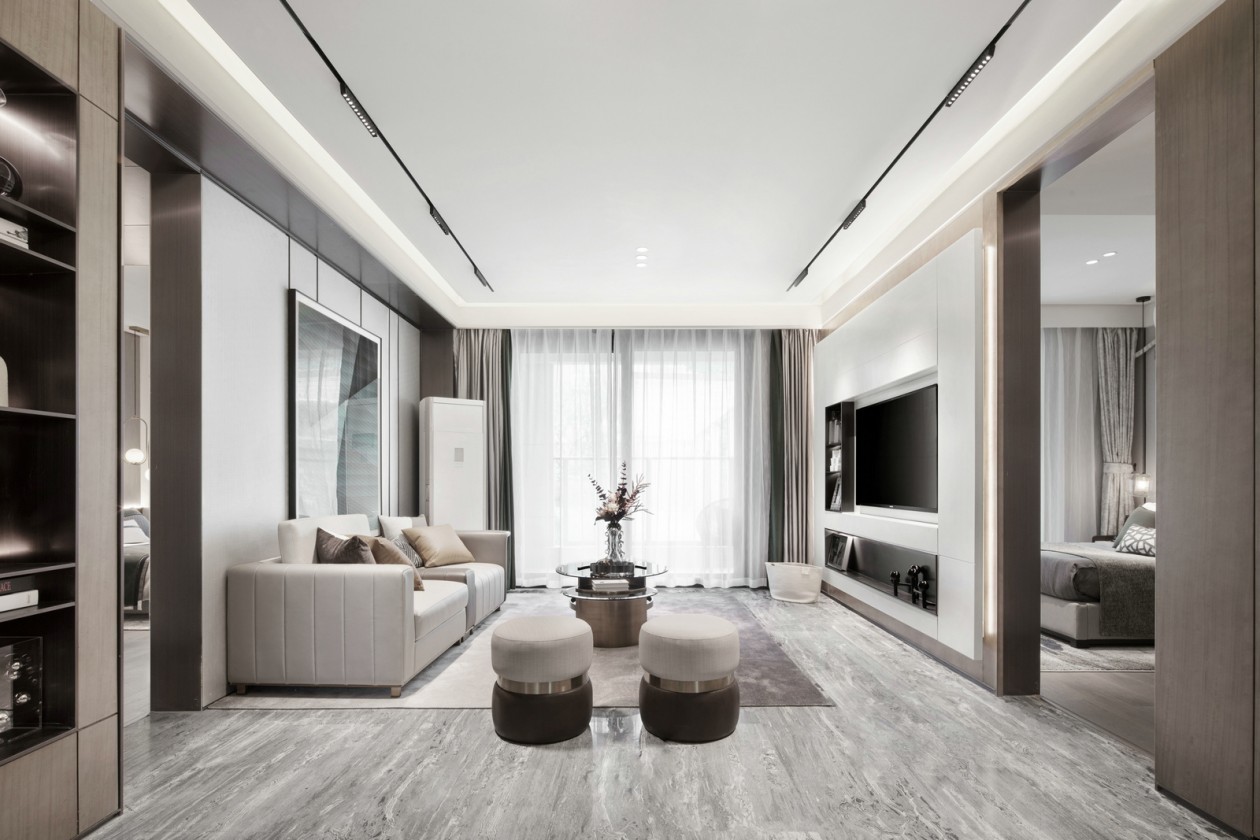 空间以沉稳的木饰面作为主体,沙发与电视背景墙则为白色烤漆板,鲜明的对比将空间层次感提升,整个空间兼具了时尚与潮流。设计师用开放式设计手法去诠释空间氛围,使整个空间舒适而明亮。