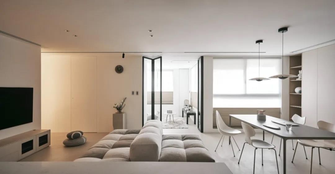 纯粹的白色与原木的结合是空间充满了简约轻盈的味道,无主灯的空间里使用磁吸灯来照明,灵活的方式使整个空间的氛围充满了自由和趣味性。