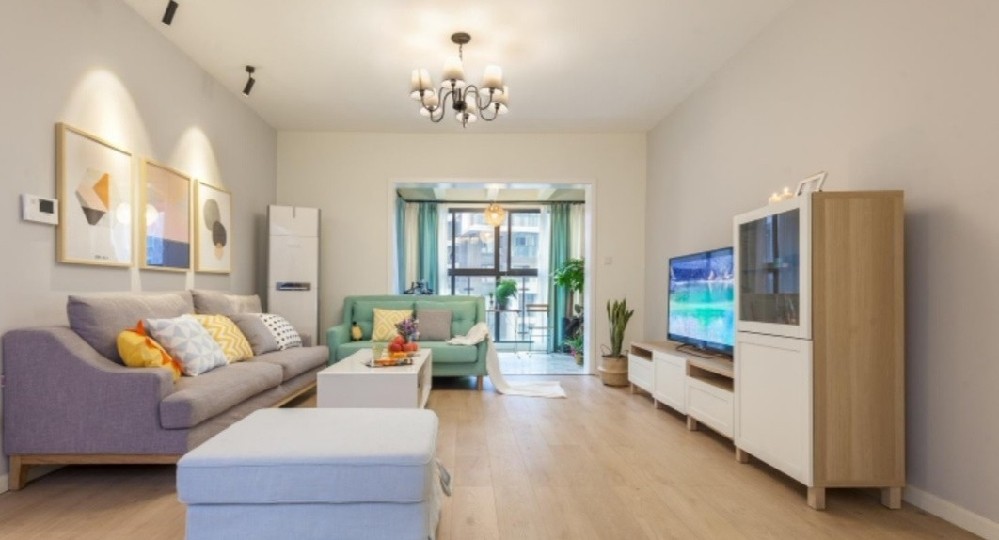 整体空间以浅灰为主调,无吊顶设计,让空间不压抑,家具布置让动线顺畅。棉麻布艺沙发组合,既环保又给予更佳的舒适体验。壁画和抱枕的色彩与纹理给空间增加一份活泼与欢快。